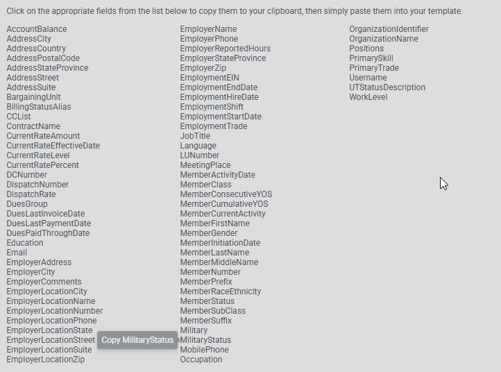 There is a list of values you can click on to copy and put into a document. These values will be auto filled when the letter is created for a member. EX: If you copy the local union value and create a letter, the local union on the letter will be equal to the member's local.