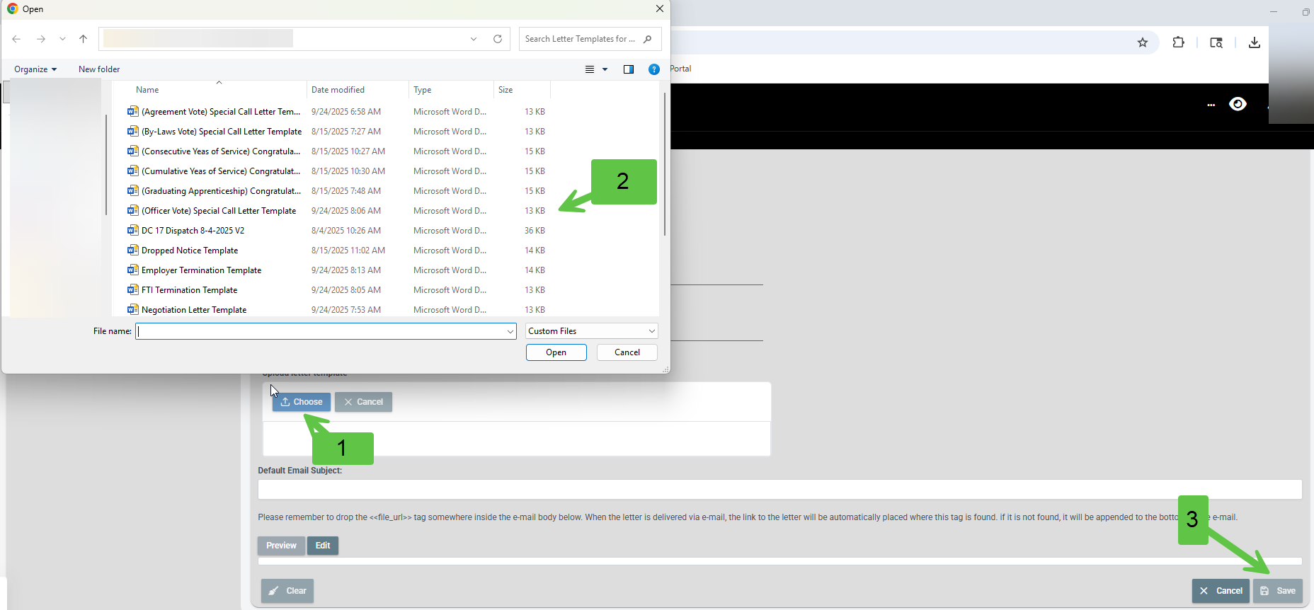 To upload a template, click the choose button and select the template you wish to upload. Then hit save.