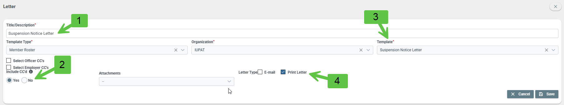 2. Select if you wish to CC people. This can be used to notify officers or staff a letter was sent to the member. The CCed person will also receive the letter.